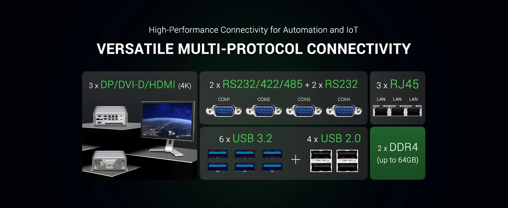 Triple independent displays (HDMI, DP, DVI-D) enable real-time monitoring and data visualization. - Reliable Industrial Connectivity –