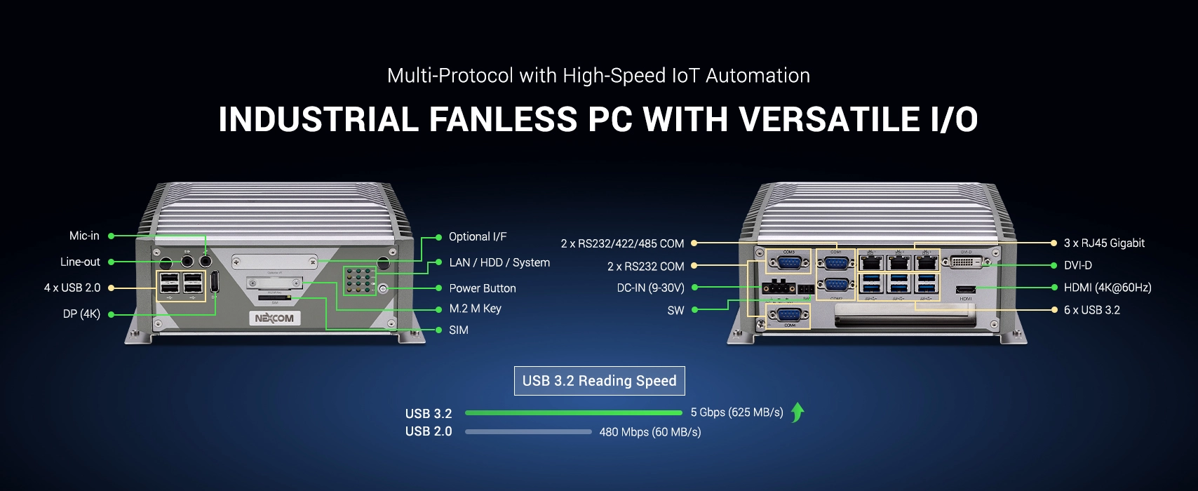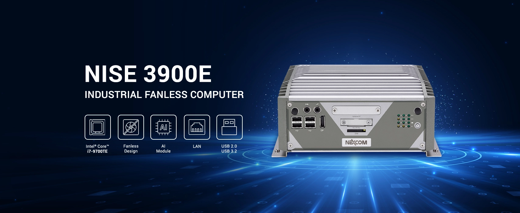 The NISE 3900E is a high-performance fanless industrial computer, engineered to handle demanding applications with 8th/9th Gen Intel® Core™ processors. Designed for reliable 24/7 operation, it features triple independent display support, multiple high-speed I/O ports, and versatile expansion options. With its rugged fanless design, wide voltage input (9V–30V DC), and industrial-grade durability, the NISE 3900E is the ultimate solution for edge computing, automation, and high-speed data processing in mission-critical environments.