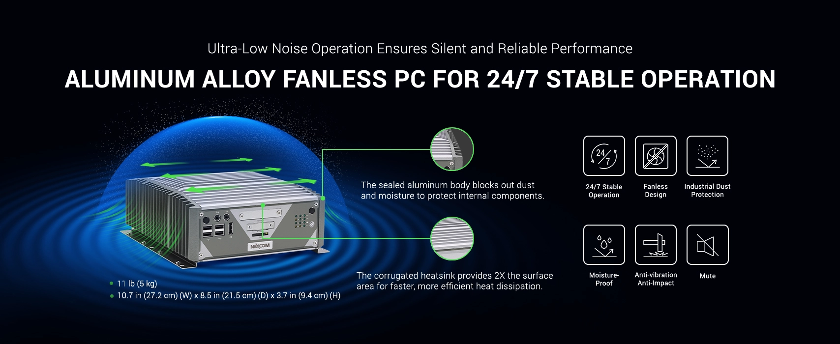 Fanless aluminum chassis, wide voltage input (9V–30V DC), and industrial-grade shock & vibration resistance for harsh environments.