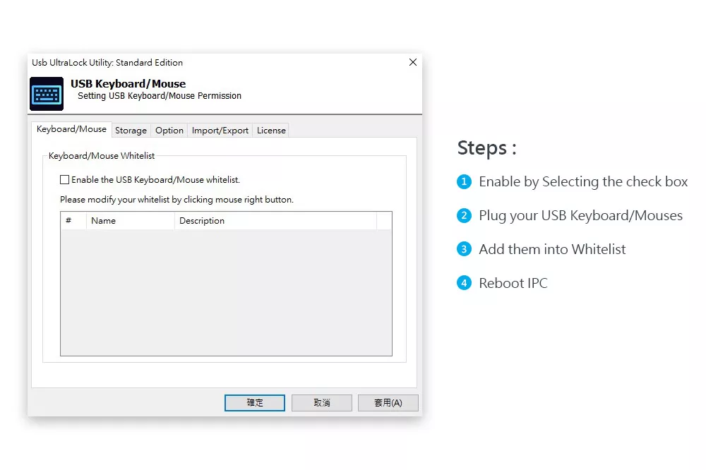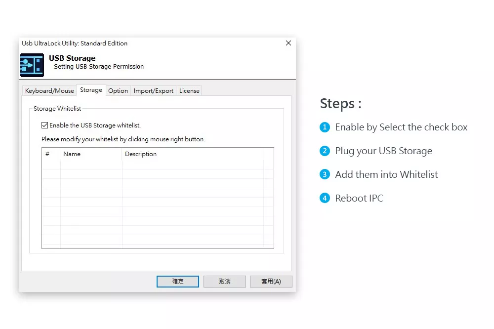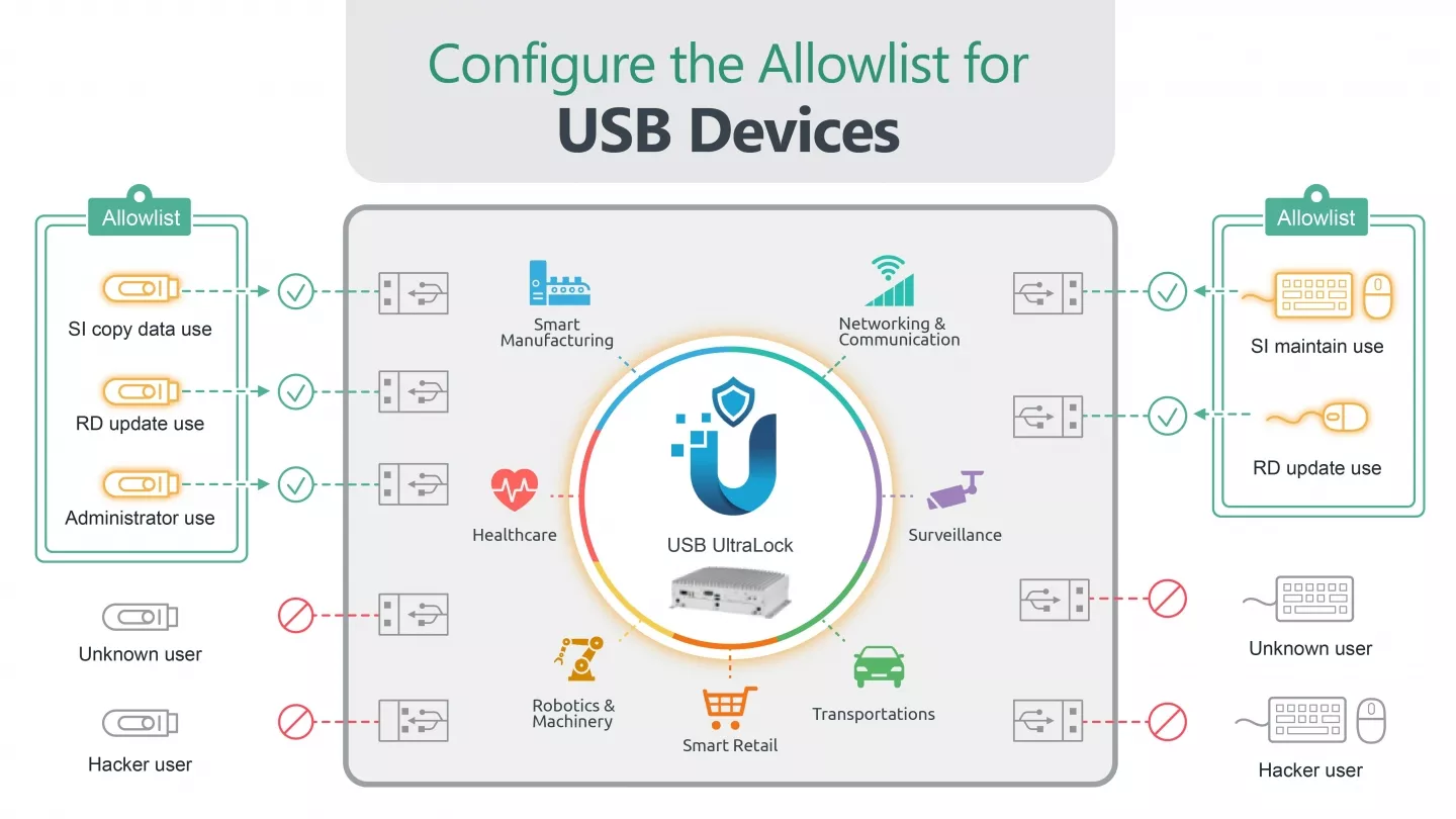 Use UltraLock to create USB allow lists for trusted storage, keyboards, and mice, while disabling unused USB ports to prevent unauthorized access and ensure system security.