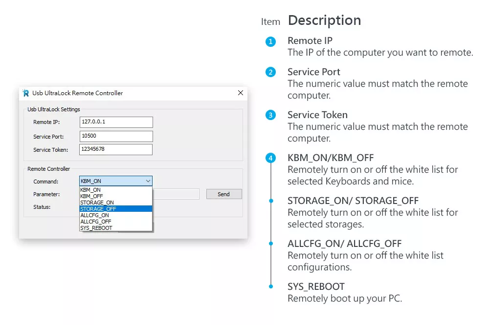 Manage which USB devices (storage, keyboard, mouse) are allowed to connect to the system, ensuring only trusted devices are used. - Remote Control: