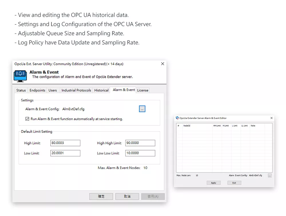 For the historical data that has been archived on the device side, it is transmitted to the analysis application. - Warning event prompt specification (OPC A&E):