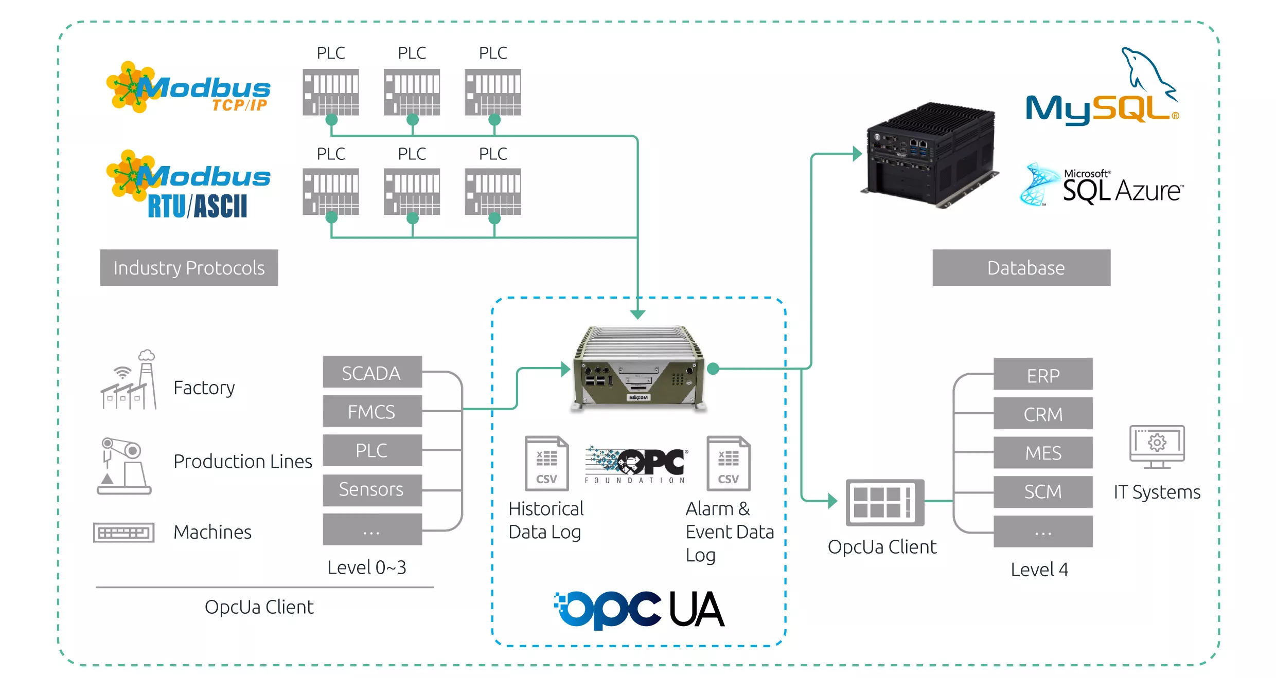 AIC OpcUa Extender Server is an Open Platform Communications Unified Architecture (OPC UA) server package focused on communicating with systems for data collection. Based on the OPC UA information model, we provide the platform required for information collection and allow users to leverage the serviceoriented architecture of OPC UA to organize their complex data into an OPC UA namespace. With features such as tag subscriptions and real-time updates, AIC OpcUa Extender Server plays a key role as a communication portal that allows OPC UA clients to manipulate HMI or PLC data. AIC OpcUa Extender Server consists of a configurable GUI for parameters and settings as well as an OPC UA server service to act as a hub for gathering data and sending them to OPC UA client applications, enabling a streamlined OPC UA system operation.